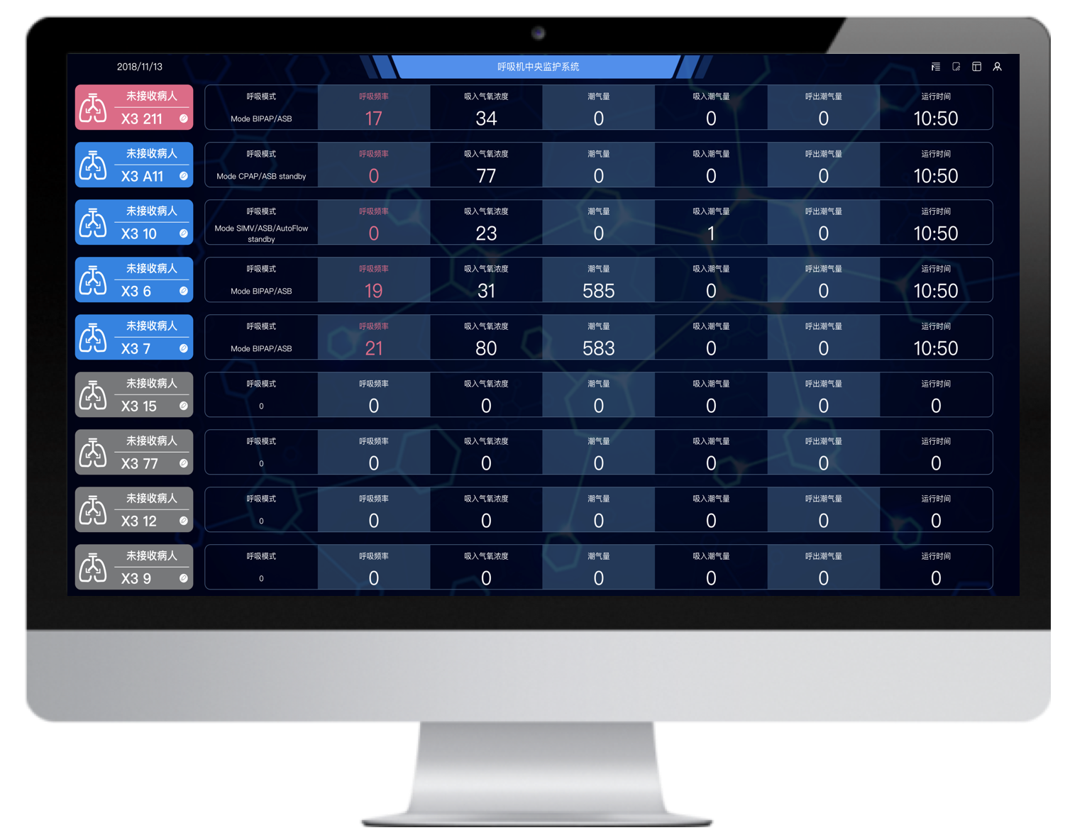 多臺不同品牌的有創(chuàng)呼吸機聯(lián)網(wǎng),并通過大屏實時集中呈現(xiàn)治療預設(shè)參數(shù)和監(jiān)測參數(shù),實現(xiàn)多臺集中監(jiān)測、集中管理和數(shù)據(jù)存儲。
